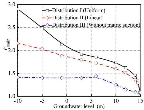 In this section, the minimum safety factor (Fsmin) under different groundwater level shown in Figure 10 was adopted to investigate the effects of the different distributions of matric suction (ua-uw) on the stability of unsaturated-soil slope. As shown in Figure 11, Fsmin is intensively related to the distribution of (ua-uw) along the buried depth. Overall, all of the three values of Fsmin corresponding to different distributions show gradual decrease with the rise of the groundwater level. However, the reduced rate of Distribution III without suction, which keeps constant (approaches to 0) under the condition that the groundwater level is below 6 m, is remarkable lower that of the other two distributions. Moreover, both of the amplitude and reduced rate of Distribution I are greater than those of Distribution II. When the groundwater level approaches to 15 m, Fsmin of the three distributions coincides with each other, in which the soil is fully saturated. The effects of distributions of (ua-uw) on Fsmin varies accordingly to the distributions. For Distribution I and II with consideration of (ua-uw), the reduction in Fsmin is due to the decrease of distributed depth of (ua-uw) (shown in Figure 1) and the increase of the pore-water pressure (Equations (13) and (16)) with the increase of groundwater level. However, the decrease of Fsmin for Distribution III regardless of (ua-uw) is mainly attributed to the increase of the pore-water pressure. Therefore, the reduced rate and amplitude of Fsmin for Distribution I and II are much greater than that for Distribution III.