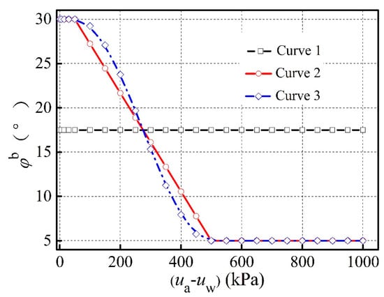 The suction angle φb was conventionally supposed to be constant and independent on (ua-uw) in the previous literature [19,51,52,53,54]. However, the multistage direct shear test results [44] showed that the relationship between φb and (ua-uw) could be depicted by Curve 3, as shown in Figure 12. When (ua-uw) is small, φb is supposed to be the maximum value φbmax. With the increase of (ua-uw), φb gradually decreases and when (ua-uw) increases to a certain value φb reaches the minimum value φbmin. Some researchers [25,55,56] used the Curve 1 and Curve 2 to simulate the relationship between φb and (ua-uw) as shown in Figure 12. Curve 1, Curve 2 and Curve 3 can be described by the following functions: