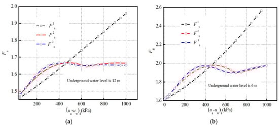 Above all, it can be found that the safety factor is sensitive to the distribution of φb and Curve 2 and Curve 3 are more rational than Curve 1 shown in Figure 13. For the sake of simplicity, it is more reasonable to adopt the linear relationship between φb and (ua-uw) in addressing the unsaturated-soil slope’s safety factor.