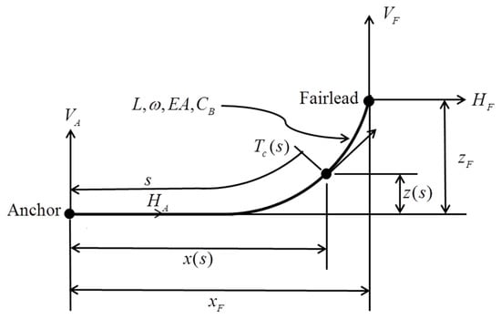 where and are the horizontal and vertical components of the effective tension in the mooring line at the fairlead, respectively, and are the horizontal and vertical components of the effective tension in the mooring line at the anchor, respectively, and are the horizontal and vertical coordinates of the reference points of the mooring line, respectively, is the apparent weight of a line in fluid per unit length of line, is the total unstretched length of a mooring line, is the cross-sectional area of the mooring line, is the coefficient of the static-friction drag between the seabed and a mooring line, and is the extensional stiffness of a mooring line.