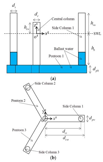 Side (a) and top (b) views of the braceless semi-submersible platform [23].