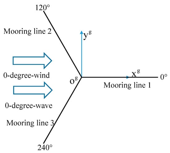 A series of representative load cases (LCs) were selected to investigate the dynamic characteristics of the ultra-large semi-submersible FOWT, the dynamic effects of mooring lines and the difference in dynamic characteristics of 5 and 10 MW FOWTs, as shown in Table 6. In the LC4 and LC7 cases, a turbulent wind field over a 200 × 200 m vertical plane centered on the rotor was generated in TurbSim using IEC Kaimal spectra based on NTM (normal turbulence model) conditions and turbulence category A. However, steady wind was selected for other load cases. The JONSWAP spectrum was used to generate the irregular wave time series. As can be observed in Figure 4, the wind and waves were correlated and directionally aligned in the positive X-direction.
