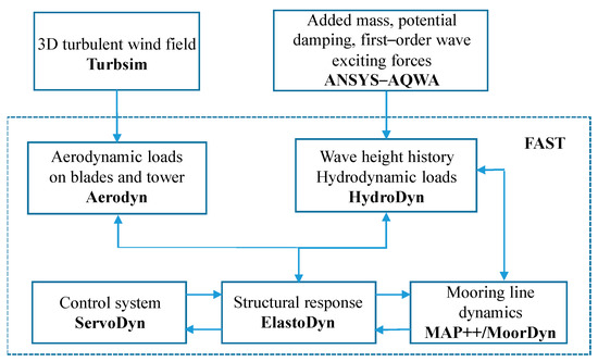 At each time step, the dynamic equilibrium equations of the rotor, drivetrain, nacelle, platform, and mooring system, with the rotor’s rotational speed and blade pitch angle regulated by the ServoDyn, were solved in Elastodyn and Map++/MoorDyn. Then, the platform motions were transferred to HydroDyn to update the hydrodynamic loads. Meanwhile, the displacements, velocities, and accelerations of the blade and tower elements were transferred to the AeroDyn to update the aerodynamic loads. The updated loads will be applied to the dynamic equilibrium equations at the next time step [3].