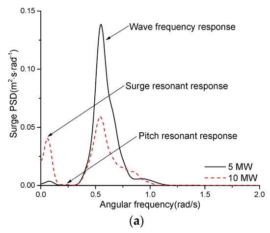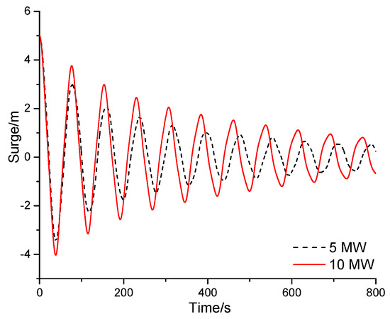 Free decay motion simulations were first conducted to study the resonant properties of the coupled system of the FOWTs. Therefore, time histories of the surge decay test and main natural frequencies of the coupled system of the 5 and 10 MW FOWTs were compared, as shown in Figure 8 and Table 5. The surge motion of the 5 MW FOWT decays faster than that of the 10 MW FOWT, but the natural frequencies of the six DOFs of the rigid body motions of the 5 and 10 MW support platforms are nearly the same. Furthermore, the first-order natural frequency of the tower of the NREL 5 MW and DTU 10 MW FOWTs are significantly different.
