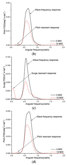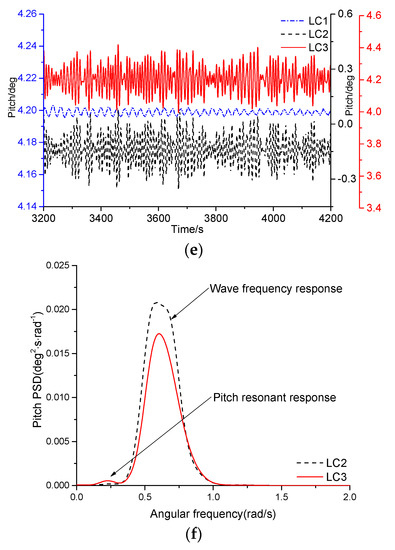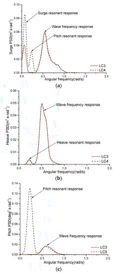 The power spectra of the system motions of FOWT in the over-rated wind speed case (LC5) and in the rated wind speed case (LC3) are compared in Figure 10. It can be observed that the surge and pitch resonant responses are significantly increased in LC5 with the blade-pitch controller, while the heave resonant response and the wave-frequency response of the system motions of FOWT have hardly changed. This resonant phenomenon is caused by negative damping from the blade-pitch controller in the over-rated wind speed range, according to [44,45].