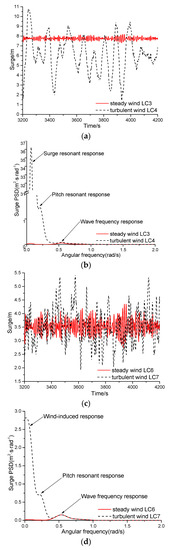 The time histories of surge motion under the steady and turbulent wind cases are compared in Figure 11a,c. The system motions are highly oscillating in time owing to the turbulent effects, which is consistent with the statistical results in Table 7. The maximum and standard deviation of the system motions increased significantly. This is owing to the turbulent wind which acted on the rotor with a time-varying longitudinal force and moments.