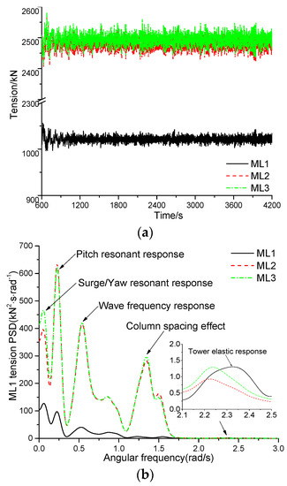 The dynamic analysis of the mooring line of the 10 MW FOWT based on a lumped-mass method is carried out by using the FAST-MoorDyn module in the rated wind speed case (LC3). As shown in Figure 12a, there is a significant difference between the tension responses of the downstream and upstream mooring lines. This is observed since the Mooring line 1 (ML1) is the only mooring line acting downstream. Consequently, the tension and fluctuating components of ML1 attained smaller values than those of the Mooring line 2 (ML2) and the Mooring line 3 (ML3).