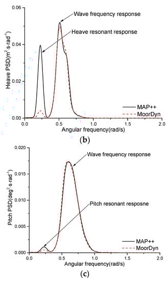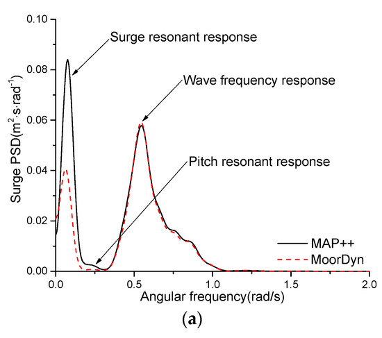 The power spectra of platform motion responses based on the dynamic (MoorDyn) and quasi-static (MAP++) mooring models were compared, as shown in Figure 13. The peak values of low-frequency resonant responses based on the quasi-static mooring model is significantly higher than that of dynamic mooring model, especially for the surge and heave motions. However, there is no significant change in the wave-frequency responses. Therefore, the dynamic effects of the mooring lines significantly affects the low-frequency resonant responses of the platform motions, while the quasi-static mooring model ignoring the dynamic effects of the mooring lines significantly overestimates the amplitude of the low-frequency resonant responses.