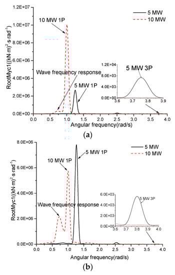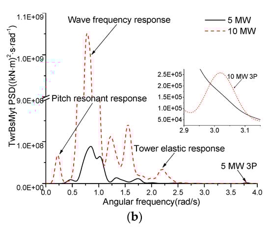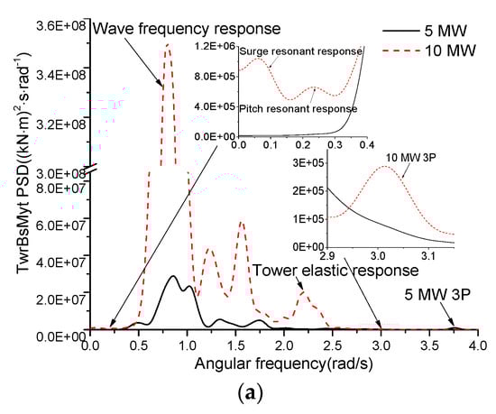 Power spectrum analyses of the TwrBsMyt response for NREL 5 MW and DTU 10 MW FOWTs were also performed in the LC3 and LC6 cases, as depicted in Figure 17. It demonstrates that the TwrBsMyt responses of the 5 and 10 MW FOWTs are mainly dominated by the wave loads for the LC3 and LC6 cases, and the amplitude of the TwrBsMyt responses of the 10 MW FOWT excited by the wave loads is significantly higher than those of the 5 MW FOWT. Furthermore, the excitation of the 3P effect on the TwrBsMyt response of the 5 MW FOWT is very prominent. However, the excitation of the low-frequency wind loads and the tower elastic response on the TwrBsMyt response of the 10 MW FOWT is significant, especially for the over-rated speed case.