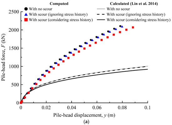 Figure 7a,b show the computed load-deflection response at pile-head at the scour depth of Sd = 0.2 D and Sd = 0.5 D, respectively. The results of the case of no scour are also presented in the figures. All the detailed values are summarized in Table 3. It should be noted that, at any given scour depth, the percentage increases in pile head deflection presented in Table 3 are relative to the values of that with ignoring the stress history effects.