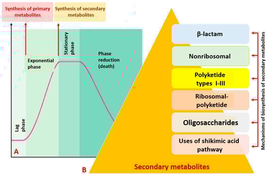 Modern science considers secondary metabolites as a group of low-molecular-weight, structurally diverse and complex bioactive compounds. It has been found that the active stage of synthesis of these molecules in microorganisms occurs at the end of the exponential and the beginning of the stationary phases of their growth (Figure 1A). Their production is induced by depletion of nutrients and adverse habitat conditions; the genes responsible for the biosynthesis of secondary metabolites are grouped together in a small number of clusters [10,12].