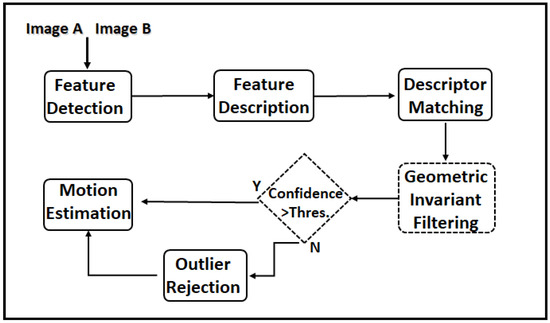 - In order to use this geometric invariant, we use triangles similar to those in [10]. As descriptor matching provides putative correspondences, we use Delaunay triangulation and compute triangles in one image using correspondences. Triangles are formed by the feature positions e.g., , and and similarly their correspondences in the second image, , and . The error between angles of corresponding triangles are computed as follows:where represents the correspondences indices forming a triangle and angles can be computed using either law of cosine or difference of angles of two intersecting line segments. Indices of correspondences are selected accordingly their error value in Equation (5) smaller than a certain threshold value. We use . We sort the features according to their number of appearance in triangles that are satisfying error threshold and keep the first m of them. The confidence level is similarly computed as a ratio of the total number of satisfying triangles and the total number of triangles used.