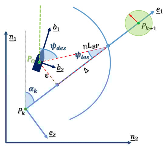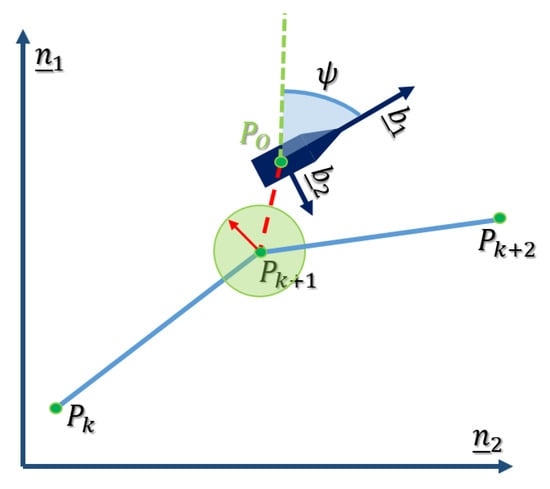 The control of the course is based on the so-called line-of-sight approach [,,]. Figure 2 draws the logic for identifying the bow angle required for maintaining the desired path, , namely the angle able to allow the vessel to regain track within a user-defined number n of vessel lengths. The guidance law deals with couples of points and update the setpoint anytime the vessel crosses the green region, as shown in Figure 2, where  and  (with ) denotes the waypoints and the correspondent desired speeds for each straight line connecting two consecutive waypoints, respectively. Moreover, R is the radius of the circle around each waypoint that provides the admitted tolerance, and  the vessel position. In order to properly define the guidance system, three frames have been introduced:  the earth-fixed reference frame,  the body-fixed reference frame, and  a path-fixed reference frame. In the following, transformations between frames are illustrated: