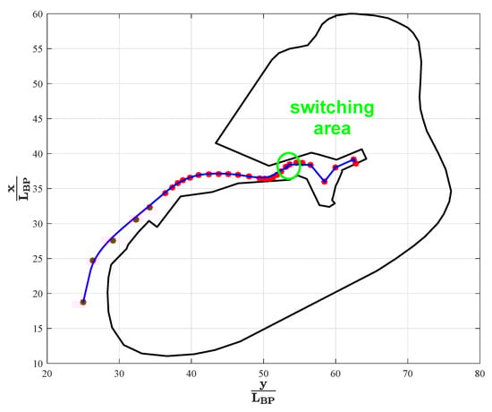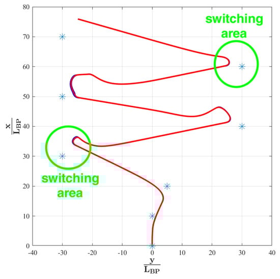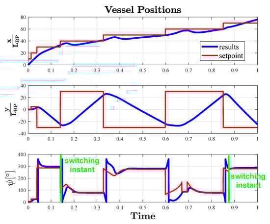 Concerning such topics, previous experiences have been gained with successful results (see, e.g., [,,]). In this paper, the focus is on the integration of known control schemes and the analysis of the performances of such a combination since the ship exhibits completely different dynamical behaviors over a wide operational range. Therefore, switching between different models and controllers is well-suited to accounting for a realistic response of the vessel and instrumental to performance improvement.