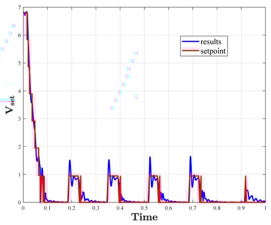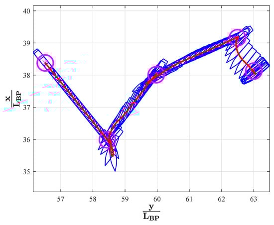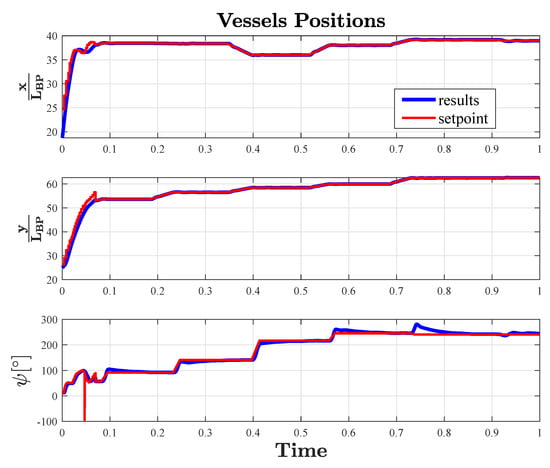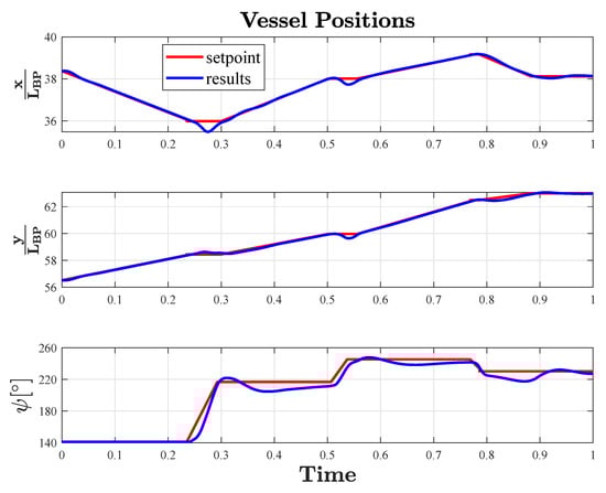 Figure 4 and Figure 5 show some simulation results for a non-trivial blue water maneuver of course-keeping in the presence of environmental disturbances. The wind is assumed to come from  North with an average speed of 30 knots and gusts (up to 50 knots) taken into account by using a Davenport model, while the current is supposed to be  knots aligned with wind and waves forces are not taken into account at this stage. In Figure 4, the desired waypoints are reported in blue stars. The red line describes the ship trajectory, whereas the two green circles represent the switching area between the autopilot and the drift-free track mode. In Figure 5, the setpoint data and the actual position and heading are compared in non-dimensional form. For confidential reasons due to a company contract, the time is normalized over the total manoeuvre duration and the trajectories are non-dimensional with respect to the ship length. The switching between autopilot and drift-free track occurs at simulation time , whereas the autopilot is activated again at simulation time . In particular, in Figure 5, up to the simulation instant 0.15, the only smart pilot is active (i.e., the requirements of heading are constant), whereas, after switching, the controller receives a new input setpoint to compensate the drift. The effects of the switch are shown in Figure 4, where before switching the drift is not compensated (the same occurs after the second switching). All the errors of positions and attitude are within the design requirements.