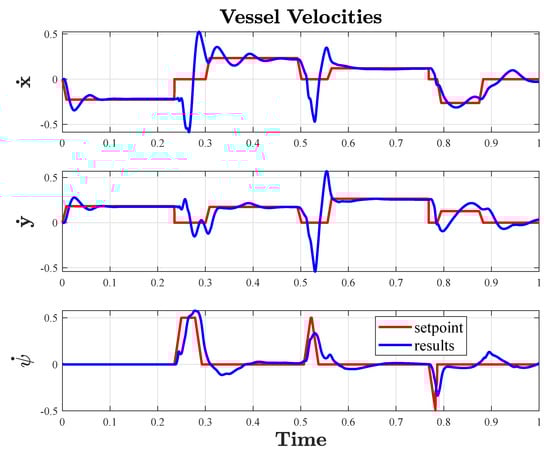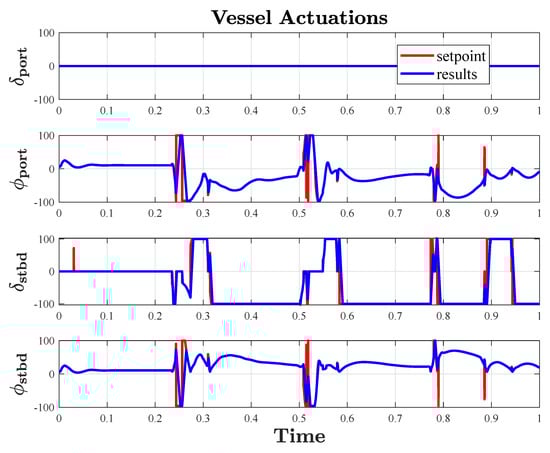 Figure 7, Figure 8, Figure 9 and Figure 10 concern the simulation results of a maneuver in a restricted area, where the ship is required to follow a given path modifying the heading between one waypoint and another in the presence of moderate environmental disturbances. The maneuver is supposed to be performed in two control modes: first, the ship keeps its position at each waypoint, thanks to the dynamic position controller; then, the movement between two consecutive waypoints is ensured by the change positioning control mode. The presented maneuver highlights the capability to switch at any waypoint between change positioning, change heading, and dynamic positioning. Figure 7 and Figure 8 show the desired and actuated paths, respectively. Details about position and velocity are plotted in Figure 9 and Figure 10, showing the effectiveness of the proposed controller, since the errors are within the design constraints. Figure 11 shows results for vessel actuations from top portside rudder and propeller pitch and starboard actuation setpoint and simulated results. All results are reported as dimensionless quantities.
