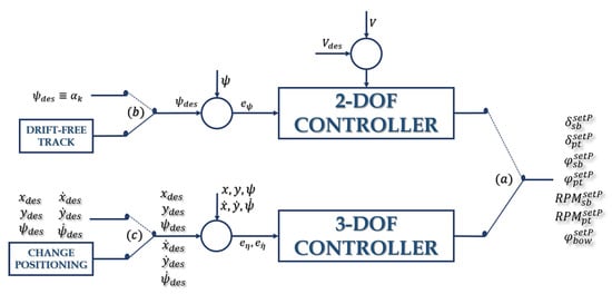 The controllers are schematized as two different types: (i) low-speed controllers, which account for the three plane motions of the ship (surge, drift, and yaw) named 3-DOF; and (ii) high-speed controllers, which deal with course and speed, named 2-DOF. As shown in Figure 1, the actuator setpoints are the same for all four defined controllers, while the controllers’ input differs.