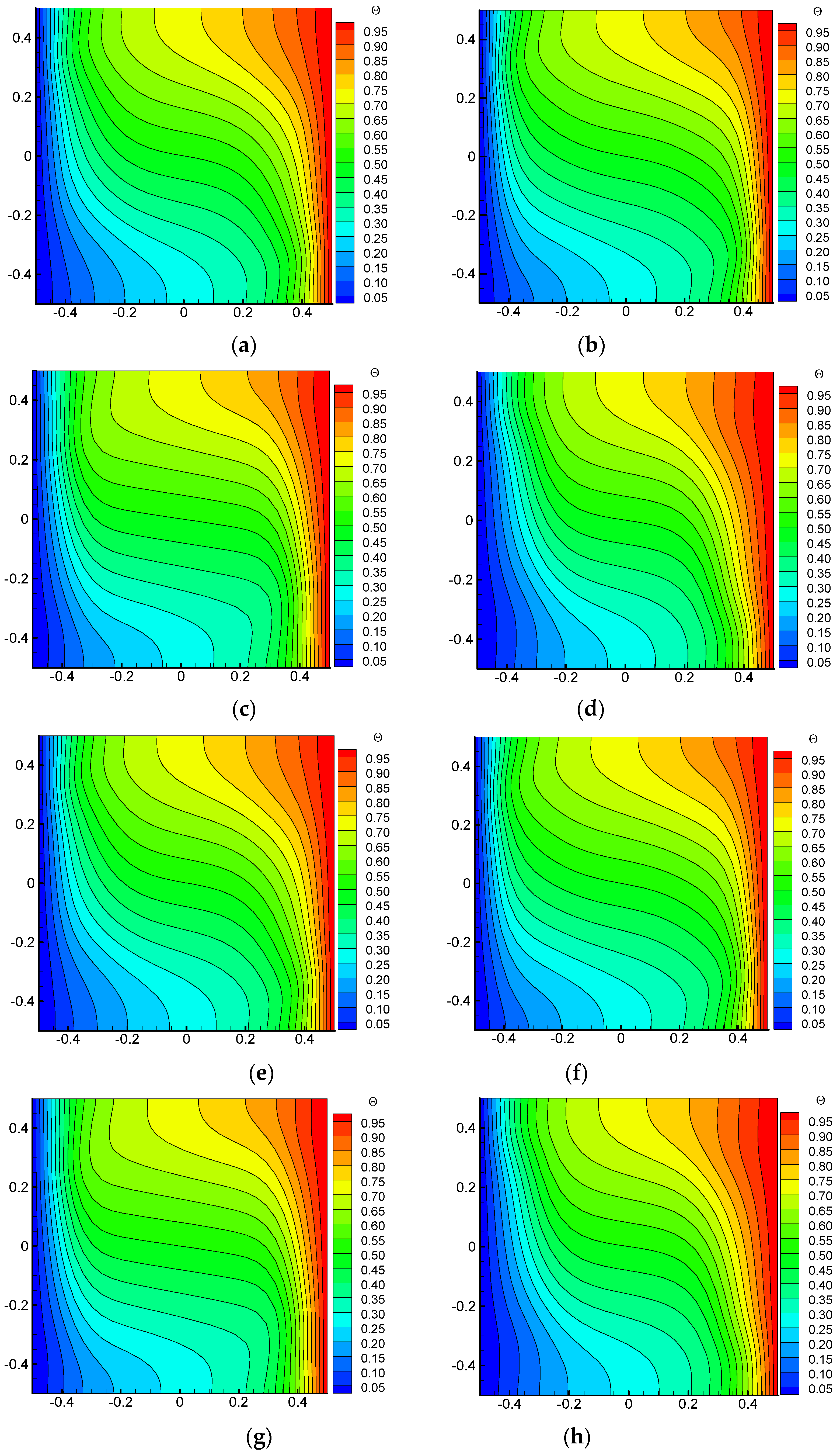 Figure 6 shows the temperature fields in x-o-y plane at Z = 0.5. It can be seen that the hot and cold boundaries present a larger influencing region due to the rotation effect. It can also be found that the thickness of the thermal boundary layer changes periodically with the rotation.
