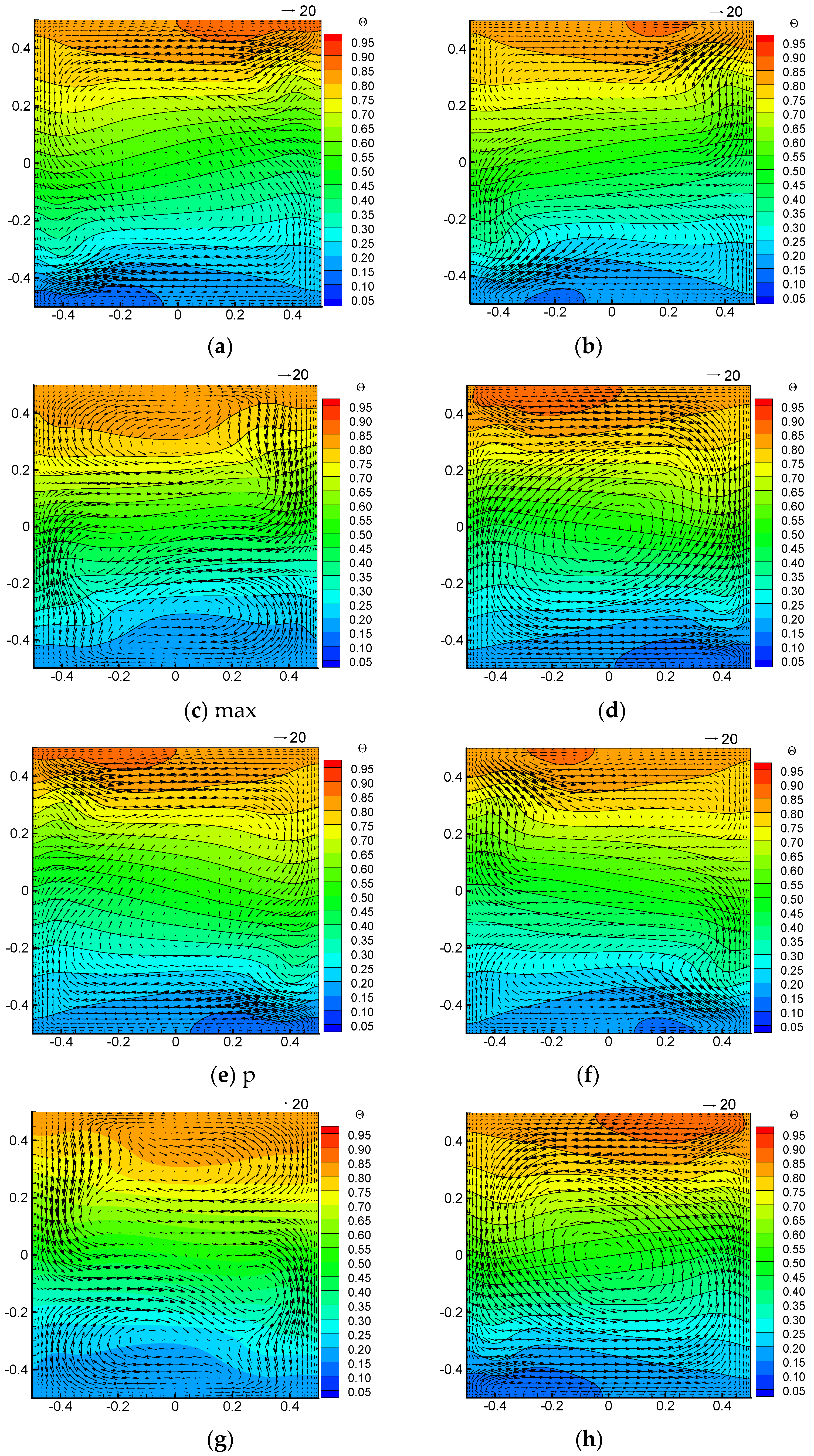 In contrast to the stationary case, the harmonic rotation introduces Coriolis forces, centrifugal forces, the Eulerian forces, and the buoyancy caused by these forces. So the characteristic of the natural convection under the interactive effect of these forces is much more complex than that in static case. Therefore, in this part, the characteristic of the natural convection under the coupling effect of these forces will be studied and the effect of the harmonic rotation on the flow and heat transfer will be clarified. According to Equations (9)–(13), the dimensionless parameters governing this kind of flows are Rayleigh number (Ra), Prandtl number (Pr), nominal rotational Rayleigh number (Raw), and nominal Taylor number (Ta). The Pr is chosen to be 0.71, which corresponds to the air. An appropriate choice of other parameters is required to obtain stable and converged solutions. Hence, for this purpose we have chosen these parameters as listed in