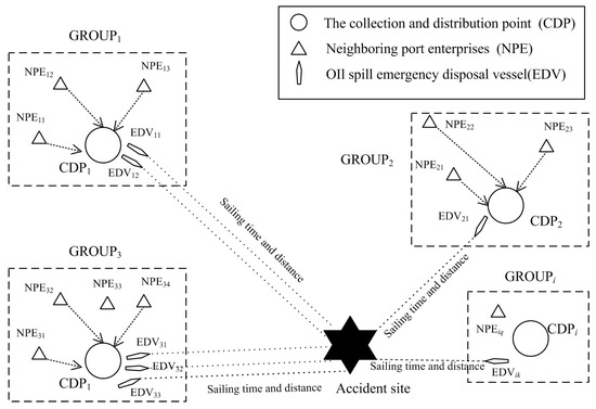 Oil spill emergency disposal vessels that belong to a collection and distribution point may perform several round trips between the collection and distribution point and accident site to carrying the materials for the emergency response. The model does not account for the time consumed at the accident site. It was considered that the sailing time of departure is the same as the sailing time for the return.