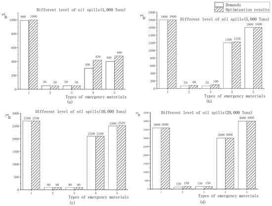 In the emergency response of small and medium oil spill incidents, the materials of several collection and distribution points near the accident site can often meet the demand. Comparing Table 3 and Table 4 with Figure 3, the model can play a better role of integrated emergency response in an extraordinarily severe oil spill accident.