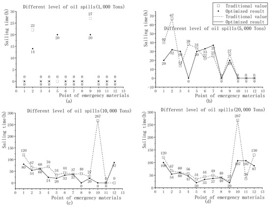 From the examples of four different grades of oil spills, it can be observed that the shipment of emergency materials and the calculation result for trips and sailing time are more reasonable and balanced. The maximum sailing time of each vessel can represent the total time of emergency materials transportation. The model and optimization calculation results also reflect the characteristics of the parallel operation of each emergency collection and distribution point, and each vessel.