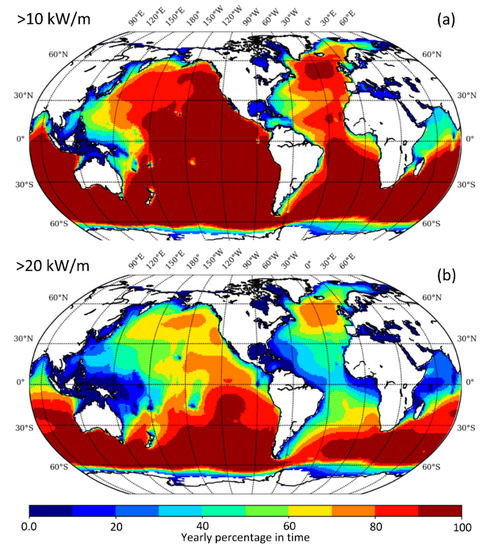 In Figure 1a,b, the persistence of wave energy for 10 and 20 kW/m, as a percentage of the year, is presented. The theoretical power was estimated following [39] the ERA-Interim database [40] from 1979 to 2017 as seen in Equation (1).