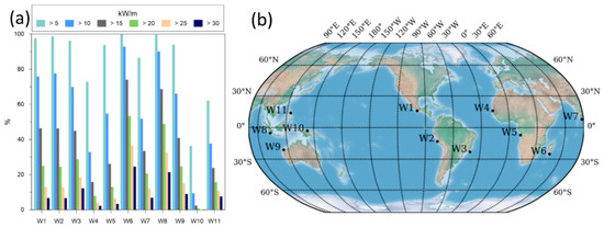 (a) Yearly availability percentage for 5, 10, 15, 20, 25, and 30 kW/m for the sites listed in Table 1, (b) location of sites W1–W11.