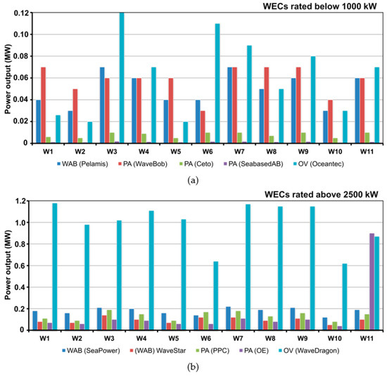 Figure 3b shows the power output for the WECs rated over 2500 kW. In this case, the overtopping device has the highest power output at almost all of the locations, except for W11 where the PA (OE) device has the highest power output. The power outputs of the other devices were very similar one to another, although the WAB (SeaPower) and the PA (PPC) have the highest power outputs.