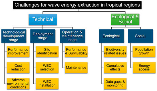 The most urgent challenges for the extraction of wave energy can be separated into technical issues concerning the devices, including the WEC technology itself, as well as its implementation (placement, operation, maintenance, and removal), and social and ecological issues, where the challenges are determining the key points in tropical conditions that must be protected (Figure 4). In this section, the technical issues related to the WECs will be addressed.