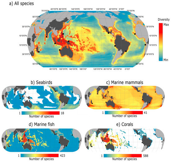 Marine diversity in the Tropics. (a) All species, (b) seabirds; (c) marine mammals; (d) marine fish; (e) corals. Black squares: Potential sites for wave energy conversion plants, see Figure 2.