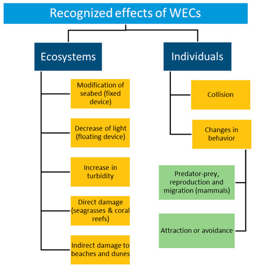 The potential effects vary depending on the phase of the WEC project. For example, during deployment, the impacts are related to water and sediment pollution, derived from chemical leaching and spills; physical damage of local ecosystems in the course of installation of support structures (including mooring lines); and changes in animal behavior such as avoidance or attraction to the project area [78]. In turn, impacts during operation and maintenance phases are possibly related to underwater noise and electromagnetic field emissions, which can produce changes in animal behavior and distribution. In addition, WECs have been associated with long-term perturbations to nearfield ecosystems derived from changing natural hydro sedimentary flow patterns around the devices, which can produce coastal erosion [76].