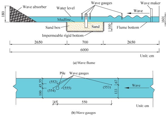 The experiments were conducted at Southwest Jiaotong University in a wave flume whose dimensions are 60 m (length) × 1.8 m (height) × 2.0 m (width). Figure 1 shows the experimental setup. As shown in Figure 2a, the wave flume is equipped with an upstream hydraulic piston-type wavemaker and a downstream wave absorber that dissipates the incoming wave energy to minimize the wave reflection effect. The wavemaker is capable of generating regular waves with a wave period of 0.6–2.0 s and a maximum wave height of 0.16 m. Located 21 m from the wave generator is a sediment tank; its dimensions are 7.0 m (length) × 2.0 m (width) × 1.0 m (depth), and it was manufactured specifically for the experiments (see Figure 3). The surrounding walls and the bottom of the test sand-pit are made of rigid and impermeable concrete. Note that the top and bottom ends of the pile are fixed with supports as shown in Figure 1, so that the vibration of the pile can be neglected.