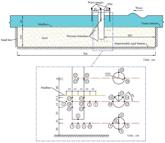 Wave flume tests have been a commonly used experimental approach to the exploration of wave–seabed interactions in the presence of a structure, although these tests have limitations that arise from the scale and the stress level within the seabed. Sumer’s research group conducted a series of wave flume experiments for both progressive waves and standing waves [24,25]. In their experiments, they focused on residual pore-water pressures and liquefaction. Recently, Qi and Gao [26,27] conducted a series of wave flume tests for wave-induced pore-water pressures around a mono-pile and discussed the relationship between pore-water pressure and local scour around a mono-pile. To the authors’ best knowledge, this might be the only experimental data available in the literature on pore pressures around a pile. In their experiments, they focused on the changes in pore pressure and scour that result from the combined action of the wave and current, and they only measured the pore-water pressure along the central line of the cylinder. Furthermore, a pile with a 20 cm diameter was fixed at the bottom of a tank with a sandy bed.