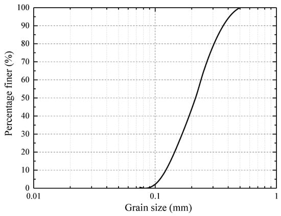 As mentioned in the introduction, different types of seabed will directly affect the mechanism of wave-induced soil response. According to Tzang and Ou, Wang et al., Kirca et al.’s [6,7,8] experimental results, the phenomenon of pore pressure build-up would be insignificant in a sandy seabed. In the laboratory experiments, due to limited resources, we can only select a particular sediment for our study. Besides, we focus on the transient soil response around a mono-pile, so the present experimental study is based solely on a sandy bed. In order to reveal the distribution of transient excess pore-water pressure, sandy sediment (quartz sand) with a mean particle size of = 0.215 mm was used as the seabed material in the experiments. The particle-size distribution of the soil sample, which was measured by sieving method, is plotted in Figure 5, where denotes the coefficient of curvature, defined by