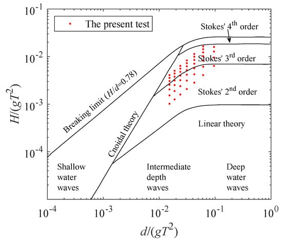 where is the wave number. According to Le Méhaut’e [28], wave conditions of the present experiments mainly fall in Stokes’ second-order and third-order wave theory zones (as shown in Figure 6). Note that, g is the gravitational acceleration.