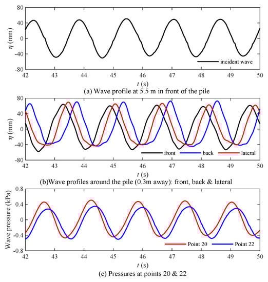 Figure 7c presents the wave pressures acting on the mono-pile (Points 20 and 22, in Figure 3). Point 20 is on the front side of the pile, and Point 22 is located on the lateral side of the pile. As shown in the figure, the wave pressure on the lateral side of the pile is less than that in front of the pile because of the wave run-up in front of the pile. The wave profiles around the pile could not only help to understand the cause of pore pressure distribution around the pile more systematically, but also provide reference for numerical simulation.