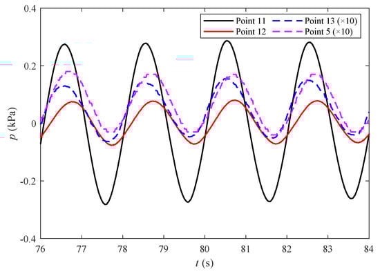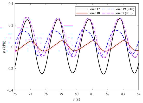 As mentioned previously, one major difference between the present experiment and the previous experiment [26,27] is that the mono-pile is placed in the seabed to a depth of 0.6 m in the present study, rather than being fully buried in the seabed [26,27]. The above results describe the pore pressures along the surface of the mono-pile. It is also interesting to investigate the distribution of pore pressures beneath the pile. For this, we plotted the pore pressures at m, which is 10 cm below the bottom of the pile, for four points: Points 5, 8, 7, and 9 (see Figure 3). Another interesting result is from the measurement point at the bottom of the mono-pile, i.e., Point 4 ( m in Figure 3). Figure 17 shows the time series of the wave-induced pore pressures at Point 4. The distribution of the pore pressures is still oscillatory, even though there is no direct wave pressure acting on the seabed surface since it is beneath the center of the pile. The pore pressures are transferred from the soil next to this point.