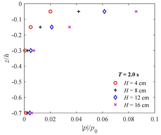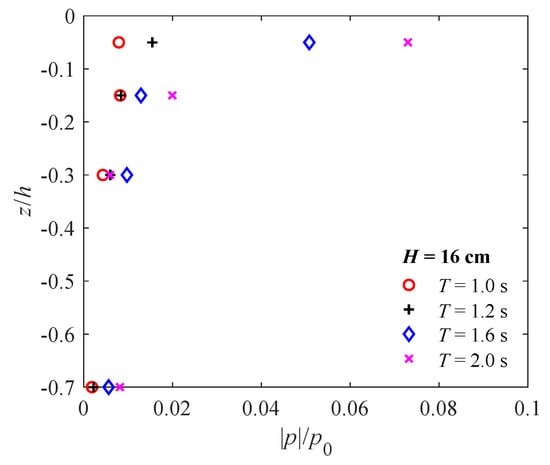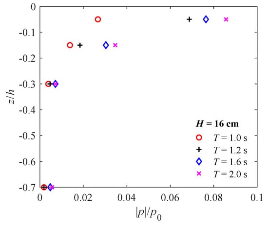 In the next example, we focus on the vertical distribution of the maximum amplitude of the wave-induced pore pressure () versus soil depth () in various wave conditions. Figure 9 plots the results for various wave periods for a wave height of H = 16 cm. Since a wave height of H = 16 cm cannot be generated for cases with short wave periods (for example, T = 0.8 s), only the results for T = 1.0, 1.2, 1.6, and 2.0 s are presented in the figure. As shown in Figure 9, the wave-induced maximum amplitude of pore-water pressure decreases with the increase of depth, which can be attributed to the gradual attenuation of the pore water pressure. Furthermore, with the soil depth increasing, the dissipation rate of pore pressure decreases. Besides, the maximum of the pore pressure increases, as the wave period increases, because the wave energy acting on the seabed becomes larger and larger, which intensifies the seabed response. These trends are more pronounced near the seabed surface (in the region between the seabed surface and 30 cm below it). For the region below 0.3 m (Points 13 and 5 in Figure 3), the influence of the wave period becomes insignificant.