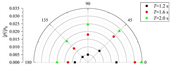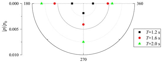 Figure 19 illustrates the effects of the wave period on the pore pressures for cm at m. As shown in the figure, the maximum pore-water pressures increase as the wave period increases. Furthermore, the largest one appears behind the pile. Combining Figure 19 and Figure 18 reveals that both the wave height and wave period significantly affect the pore pressure at z = −0.7 m.