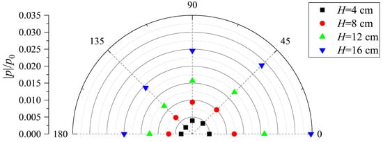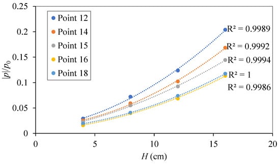 Figure 15 plots the distribution of the pore-water pressures around the mono-pile for various wave heights for T = 2 s at m. As shown in the figures, the pore-water pressure in the front () is the largest, while that in the rear is the smallest, which is close to Sui et al.’s numerical simulation results [16]. It is also noted that as the wave height increases, the pore pressure increases more rapidly. Figure 16 shows the quadratic polynomial fitting curves of the relationship between pore pressure and wave height at different points around the pile, in which is the coefficient of determination. According to Figure 16, the fitting curves are in good agreement with the experimental results, which suggests that pore pressure is related to wave energy (). As for the difference of the curves for different points, it may be because the presence of the pile changes the distribution of the wave energy.
