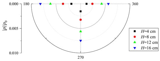 Figure 18 illustrates the effects of wave height on pore pressure for s at m. As shown in the figure, the pore pressure increases as wave height increases for larger wave energy. However, the largest pore pressure occurs behind the pile, while the smallest occurs in front of the pile (). This result was not reported in the previous experimental study [26,27] because the pile was fully buried in the seabed. Note that the magnitude of the pore-water pressures at m are much smaller than those at m. The reason may be that the seabed below the pile is not directly under wave loading—the pore pressures are transferred from the surrounding soil under direct wave loading. The pore pressures of these points have to be affected by the structure; if there is no structure, the pore pressure distribution should be monotonous. Besides, Figure 17 clearly shows the horizontal propagation of the pore pressure under the pile.