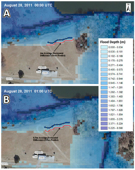 Figure 3. Comparison of GPS maximum flood extent observations (depicted as blue dots) in Hampton, VA, following debris lines remaining after Hurricane Irene 2011, used to geospatially verify model performance at (A) 00:00 UTC and (B) 01:00 UTC on 28 August 2011. GPS data collected by volunteers effectively illustrate the challenge with temporal matching for model comparison. - (2)