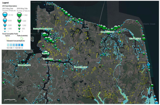 Following 2017′s success, Catch the King was repeated during the highest astronomical tide of 2018 on 27 October. This event was less attended as it immediately followed a strong nor’easter in a day prior, on 26 October. Still, significant response from the event’s many volunteers, fueled by the local media partners’ coverage leading up to the event, and 42 separate volunteer training events held all over Hampton Roads, resulted in 347 participants collecting 33,847 time-stamped GPS maximum flooding extent measurements and 458 geotagged photographs during the event [34]. There were 141 additional volunteers who collected 3881 GPS data points during the nor’easter’s peak flood period coinciding with the high tide the night before the king tide. Combined, those totals are 488 participants and 37,728 GPS points during the 2018 Catch the King and nor’easter event, with 431 of those being unique volunteers and 57 having mapped the king tide on both the 26 and 27 October 2018 [35].