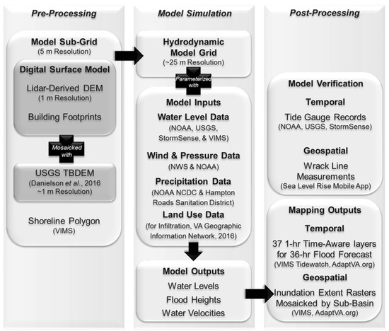 Inherently, hydrodynamic models are best validated with water level sensors, due to the precision afforded by defining the timing and depth of inundation at a location in an automated manner [1,2,3,4]. As a result of decreased technological costs, low-cost low-energy networks of water level sensors leveraging the Internet of Things (IoT) are beginning to dramatically densify the flood data available in urban environments in coastal areas throughout the world [5,6]. Hampton Roads, VA, USA, hosts one of these IoT networks called StormSense. The network functions as a flooding resiliency partnership between the Virginia Commonwealth Center for Recurrent Flooding Resiliency (CCRFR) and several coastal cities in Hampton Roads [7]. The network’s primary goal is to monitor and transmit automated flooding alerts in real time when inundation occurs [8,9] However, an additional function of these sensors is the integration with federal sensor data from the US National Oceanic and Atmospheric Administration (NOAA) and the US Geological Survey (USGS) to validate and improve the Virginia Institute of Marine Science’s (VIMS) flood forecast models [7,8,9].