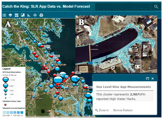 Spatial data collected for each king tide event were aggregated through the Sea Level Rise mobile app and shared online using interactive web maps, so that volunteers with minimal GIS experience could visualize their own GPS observations populate the Tidewatch model’s predictions in near-real time (Figure 6). This level of data accountability implemented an open interaction where users could conduct their own analyses and make their own mean difference calculations through ArcGIS Online’s distance and area measuring tools from their data in a web browser while viewing the public map. This data interactivity spurred high engagement and participation for students involved in STEM research or related educational classes. Figure 6A shows an aggregated point map of 59,718 high water marks superposed with the Tidewatch Maps throughout the greater Hampton Roads region and showcases the extent of areas not covered by automated sensors that were surveyed through Catch the King in 2017 (Table 1).