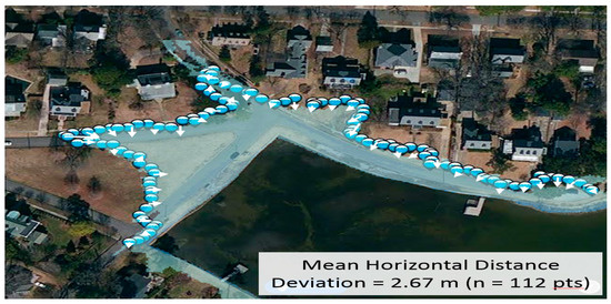 Given that flood impacts for king tides are simply tidal calibration data that are likely to be aligned along similar elevation contours without intervening atmospheric conditions, linear distance metrics can be useful to compute spatial differences in relatively flat areas. The standard distance formula may then be computed by GIS software to calculate the difference between each GPS data point to the nearest predicted inundated space. To compute this, the modeled geospatial flood depths served through VIMS’ Tidewatch Maps were converted into vector data polygons, with the maximum flood extent representing the 0 m flood contour. As the volunteers were instructed to map inundation in their communities by dropping time-stamped digital GPS breadcrumbs, the citizen scientists’ data should ideally represent the observed GPS flood extents, and in most places, the model had an overwhelmingly favorable agreement. Figure 7 shows an example in Norfolk’s Larchmont neighborhood adjacent to a dog park, where flooding is frequent, and the 112 points were used to compare with the light blue modeled flood extents as a linear distance, and averaged to form a mean horizontal distance deviation (MHDD) metric, which yielded an average deviation of 2.67 m for this site during the 2018 king tide.