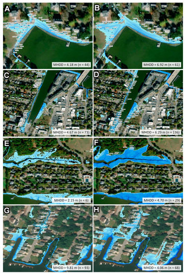 Likewise, several other areas, ranging from residential, commercial, and industrial land uses, during the 2017 king tide are featured in Figure 8. Since Tidewatch Maps provide more than simply a maximum inundation extent, unlike tidal depths estimated from a bathtub model or a sea level rise topographic flood elevation viewer, temporal accuracy can also be assessed through the GPS timestamps reported on each user’s measurements through the Sea Level Rise app. Figure 8A,C,E,G, shows a model distance comparison of forecasts and data from 13:00 to 13:59 UTC. Figure 8B,D,F,H show observation data and model forecasted depths for the same sites an hour later from 14:00 to 14:59 UTC. These figures are used to show varying flooding conditions during the king tide on 5 November 2017, which occurred at 14:30 UTC, similar to those noted in Figure 3 during 2011 Hurricane Irene. Figure 8 shows individual sites where monitoring efforts took place in 2017 and ultimately contribute to the overall figure of +/−5.9 m in horizontal difference between the maximum extents predicted via the Tidewatch Maps and the 59,718 high water marks measured through Catch the King.