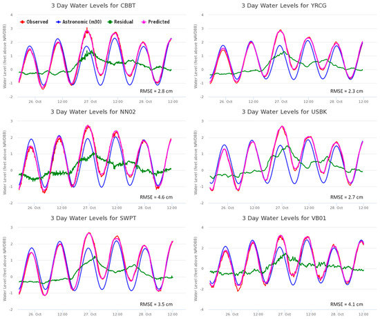 Time series of six Tidewatch Charts’ water level sensors’ observations (red), astronomical tidal estimations (blue), and computed residual difference (green), compared with SCHISM model predictions (pink) from Tidewatch Maps during Catch the King at 10:30 on 27 October 2018; UTC-5.