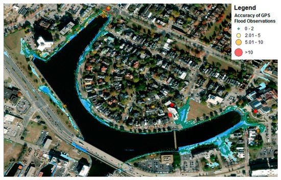 - Points with a radial accuracy metric >10 m (32 ft) were too inaccurate to include, as they misrepresent the degree an area was inundated, favoring over-prediction (Figure 10).